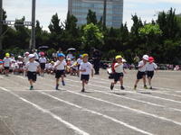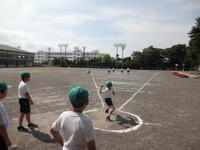 ドッジボール、タイヤ跳び、、ブランコ、鬼ごっこなど、思い思いの遊びを楽しんでいる様子、中には、運動会に向けて、リレーの練習を始めているクラスもありました。子供たちが集まり、運動場はとても活気に満ちていました。