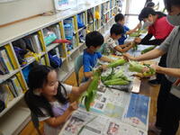 今日は2年生が給食で提供されるとうもろこしの皮むきをお手伝いしてくれました。まずは先生たちから、やり方や注意を聞きます。次に、かご一杯のとうもろこしが配られ、一斉に皮むきのスタートです。子供たちはとうもろこしの観察をしながら、丁寧に一枚一枚皮をむき、ひげをとっていきます。あっという間にきれいな黄色の実が出てきました。今日の給食でおいしくいただきたいと思います。2年生の皆さん、ありがとうございました。