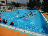 水着の上に普段着を身にまとい講習を受けます。目的は「浮くこと」です。さまざまな方法で浮く練習をしました。ライフジャケットを着ているとき、ペットボトルを持っているとき、ビニル袋に空気をためて浮く方法、何も持たずにどうやって浮くことができるかと丁寧に教えていただきました。脱力ができている人は何も持たずにかなりの時間浮くことができていました。講習会を終えて、「楽しかった」「勉強になった」と満足した様子が見られました。もしもの時に備えて、とてもいい経験ができたと思います。