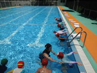 みんなで、水中どろけい(鬼ごっこ)などをしながら、少しずつ、体を水に慣れさせてていくようです。