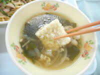 今日の給食の「おこげ入りわかめスープ」はおこげをスープにひたして食べます。少しだけスープにひたして食べるとサクサク食感が、しっかりスープにひたすともっちりした食感を楽しめます。自分の好みにあわせて楽しみましょう。