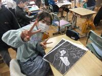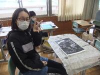 5年生が版画の彫る作業が終わり、印刷をしてみました。ローラーでインクを伸ばし、その上に和紙を重ねます。そして、バレンでこすります。和紙をはがすと、きれいにできあがります。さらに、5年生は、乾いてから絵の具で色を付けます。完成が楽しみです。