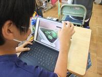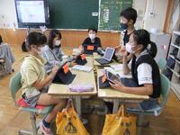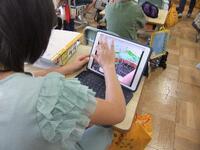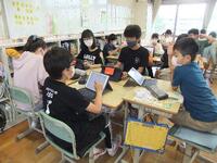 各教科の学習で、タブレットの活用場面がどんどん増えています。タブレットを使った学習は、基本的には個別学習になります。1時間の授業の中で、タブレットの活用する時間と、ノートや教科書に向かい合う時間をしっかり区別することが必要です。また、タブレットの使う中でも、個別学習と写真のように協働学習することも考えています。