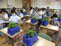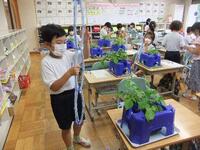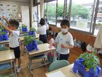 1年生が、生活科の学習で観察している「アサガオ」です。本葉も出て、かなり大きくなりました。今日は、はちに支柱をつけていました。きっとこの支柱につるを巻き付けて、もっともっと大きくなっていくでしょうね。何色の花が咲くでしょうか。