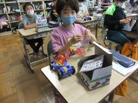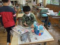 3年生は図工の時間に「くるくるランド」を作っています。4つの場面を考え、それぞれマジックや折り紙を使って表現します。これを貼り合わせて、土台の上をくるくる回るようにして、完成です。