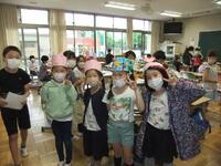 2年生が図工の時間に「すてきなぼうし」を作りました。思い思いに色画用紙や折り紙をつけ、輪ゴムで止めて完成しました。すてきなぼうしができましたね。