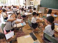 1年生は算数で、たしざんを学習しています。今日の授業は、長方形の画用紙を配って、表に自分で計算問題を書きました。例えば、5+3とか2+4などをです。裏には、答えを書いて、友だちと問題の出し合いをしました。とても盛り上がっていました。