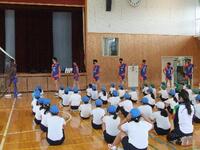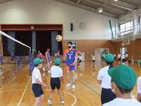 6月7日(火)、5年生がバレーボール体験授業を行いました。この授業は、地元の東レアローズ男子バレーボール選手9人のご協力をいただきました。190cmを超える選手が目の前に立ち、わくわくドキドキの子供たちでした。6人が1グループになり、選手1人がつき、パスやスパイクの仕方を指導してもらいました。あっという間の1時間でした。