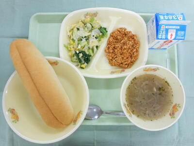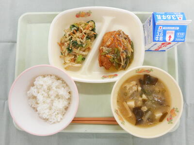 今日の給食の「呉汁」は日本各地に伝わる郷土料理です。大豆を水に浸してすりつぶしたものを「呉」といいます。そしてその「呉」をみそ汁にいれたものを「呉汁」といいます。大豆といろいろな野菜を一緒に食べることができる栄養価の高い汁物です。残さず食べましょう。
