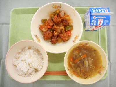 麦入りごはん 牛乳 酢豚 中華春雨スープ