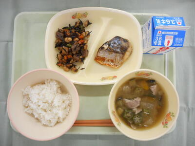 麦入りごはん 牛乳 さばのピリッと焼き 大豆のいそ煮 夏野菜みそ汁