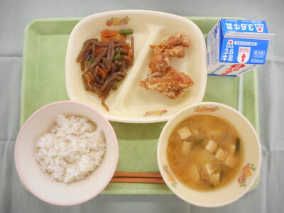 麦入りごはん 牛乳 とりのからあげ こんにゃくの炒め煮 みそ汁