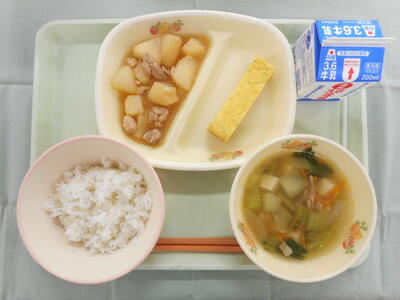 麦入りごはん 牛乳 しらすとあおさの厚焼玉子 じゃがいもととうがんの煮物 チンゲンサイのスープ