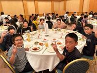 部屋に荷物を置くと、次は待ちに待った夕食です。夕食会場に集まると、目の前の料理に笑顔があふれます。ジュースで乾杯して、おいしくいただきました。