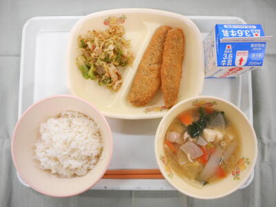 麦入りごはん 牛乳 かますフライ 三島野菜のおかか和え 三島野菜たっぷり豚汁