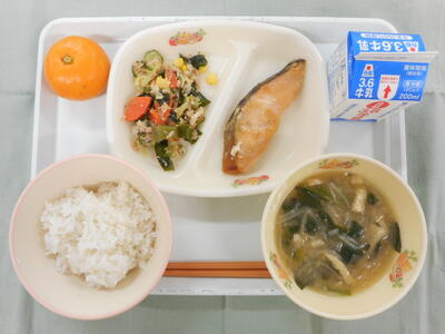 麦入りごはん 牛乳 さけの西京焼き わかめとツナのサラダ みそ汁 みかん