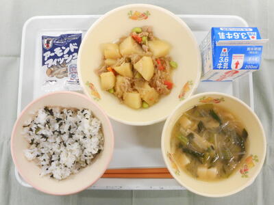 わかめごはん 牛乳 肉じゃが 豆腐と小松菜のみそ汁 アーモンドフィッシュ