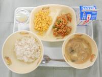 今日の給食はオムライスです。チキンライスの上に玉子焼きをのせて、ケチャップをかけて食べましょう。