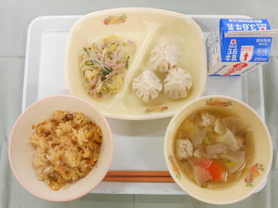 キムチチャーハン 牛乳 ポークパオズ 春雨サラダ 冬野菜スープ