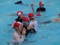 5年生は、もしものときに自分の命を守ることができるように、「着衣泳」を体験しました。服を着たまま水の中に入り、歩いてみたり泳いでみたりして、水着だけの時とはまったく違うことが分かりました。「重かった」「泳げなかった」と感想が出ていました。その後、ペアになって背浮きやペットボトルを使って浮く練習をしました。もしもの時に備えていい練習ができたと思います。