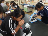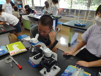 水の中の小さな生物を探しています。池から採取してきた水をスライドガラスに落として、プレパラートを作ります。それを顕微鏡でのぞき込み、目を凝らして探していきます。なかなか見つからないようで、何度もプレパラートを作り直していました。細かく動いている「ワムシ」を見つけて喜んでいる班もありました。