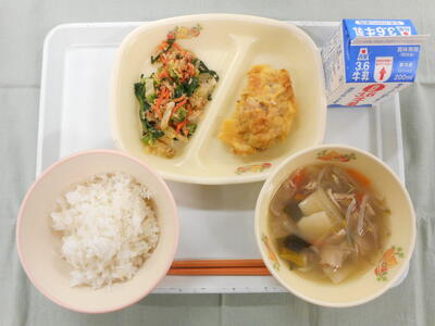 今日は6年2組が家庭科の授業で考えた献立です。旬の食材を取り入れた献立を考えてくれました。キャベツ・だいこん・葉ねぎはそれぞれ三島市の生産者さんが北小へ直接届けてくれています。三島市で育った新鮮でおいしい野菜の味を味わってくださいね。