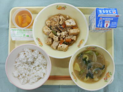 麦入りごはん 牛乳 生揚げの五目煮 みそ汁 手作りピーチゼリー