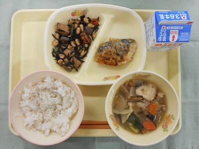 麦入りごはん 牛乳 さばのねぎみそ焼き 大豆の磯煮 せんべい汁