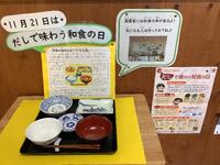 和食についてもっと学べるように、1人1枚和食についてのおたよりを配っています。また、げたばこの近くには和食についての展示を用意し、図書室には期間限定で和食コーナーを作っていただきました。
