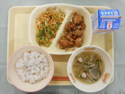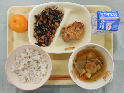 麦入りごはん 牛乳 とりのあまこうじみそ焼き 大豆のいそ煮 すまし汁 みかん
