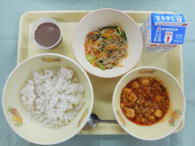 麦入りごはん 牛乳 豆腐のチリソース 春雨の中華炒め 豆乳ココアプリン