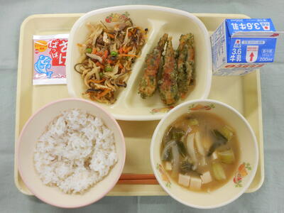 麦入りごはん 牛乳 ちくわのいそべあげ 切り干し大根の煮物 みそ汁 さけふりかけ