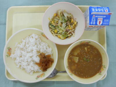 麦入りごはん 牛乳 さといものミートカレー 福神漬 ツナサラダ