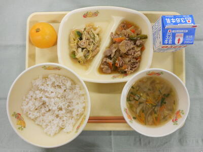 麦入りごはん 牛乳 焼き肉 煮びたし はるさめスープ みかん