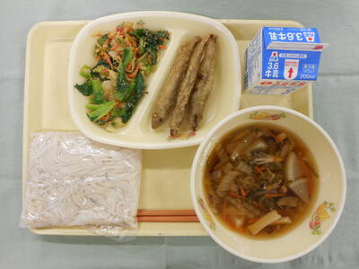 うどんすき(うどん・うどんすき汁) 牛乳 ししゃもフリッター ごま和え