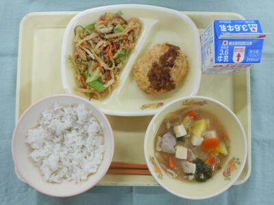 麦入りごはん 牛乳 三島コロッケ・ソース 切り干し大根のごま和え 静岡野菜たっぷり豚汁