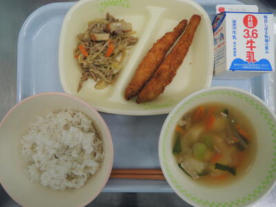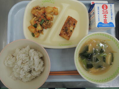 麦ご飯・牛乳・いわしの生姜煮・野菜の塩麹炒め・みそ汁・チーズ