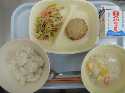 麦ご飯・牛乳・里いもコロッケ・ごま和え・厚揚げ入り豚煮