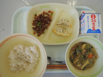 麦ご飯・牛乳・中華丼・焼き餃子・いんげん豆の甘辛揚げ