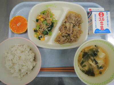 麦ご飯・牛乳・肉と野菜の塩麹炒め
