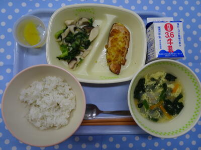 麦入りご飯・牛乳・鯖のカレーチーズ焼き・青菜のアーモンド和え・ポテトスープ