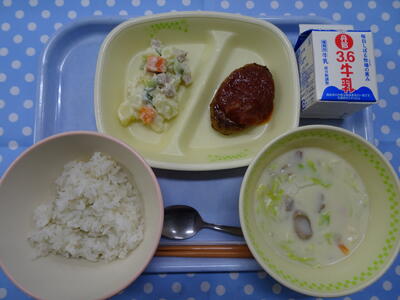 麦入りご飯・牛乳・ハンバーグ・トマトソース・マセドアンサラダ・春キャベツのクリームスープ