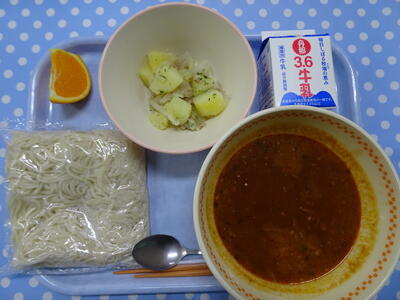 ソフト麺・ミートソース・牛乳・ジャーマンポテト・清美オレンジ