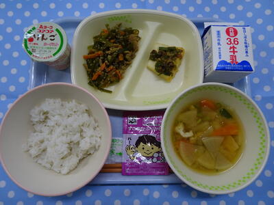 麦入りご飯・牛乳・いかのねぎ味噌焼き・茎わかめのきんぴら・りんごヨーグルト・鮭ふりかけ