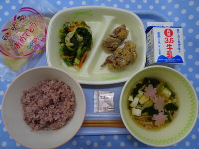 赤飯・ごましお・牛乳・とりの唐揚げ・おひたし・すまし汁・お祝いデザート