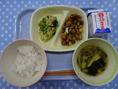 麦入りご飯・牛乳・鰆の中華和え・煮浸し・若竹汁