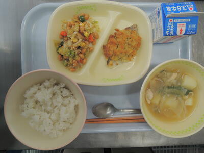麦ご飯・牛乳・たらのマヨネーズ焼き・ビーンズサラダ・ポテトスープ
