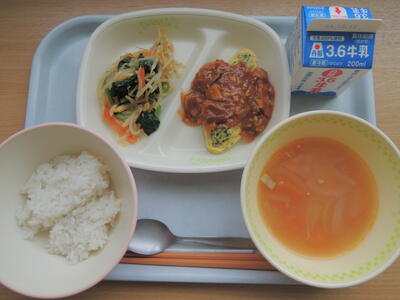 麦ご飯・牛乳・ほうれん草のオムレツ ブラウンソースがけ・青菜のアーモンド和え・ラビオリスープ