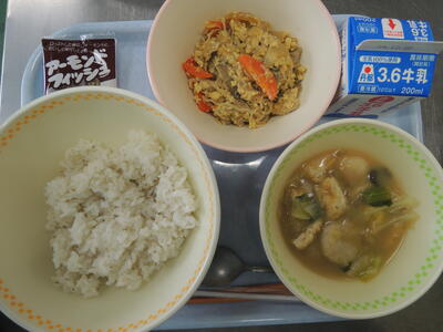 麦ご飯・牛乳・二色丼(鶏そぼろ・炒り卵)・具だくさん汁