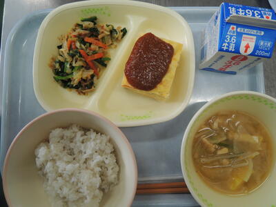 麦ご飯・牛乳・ポテトの卵焼き(卵焼きソース)・三島野菜のおひたし・静岡野菜の呉汁